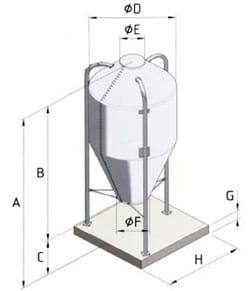 | Silo Model m3 | Ca. kapacitet Tons | Antal ben | A | B | C | D | E | F | G | H | Vægt kilo |